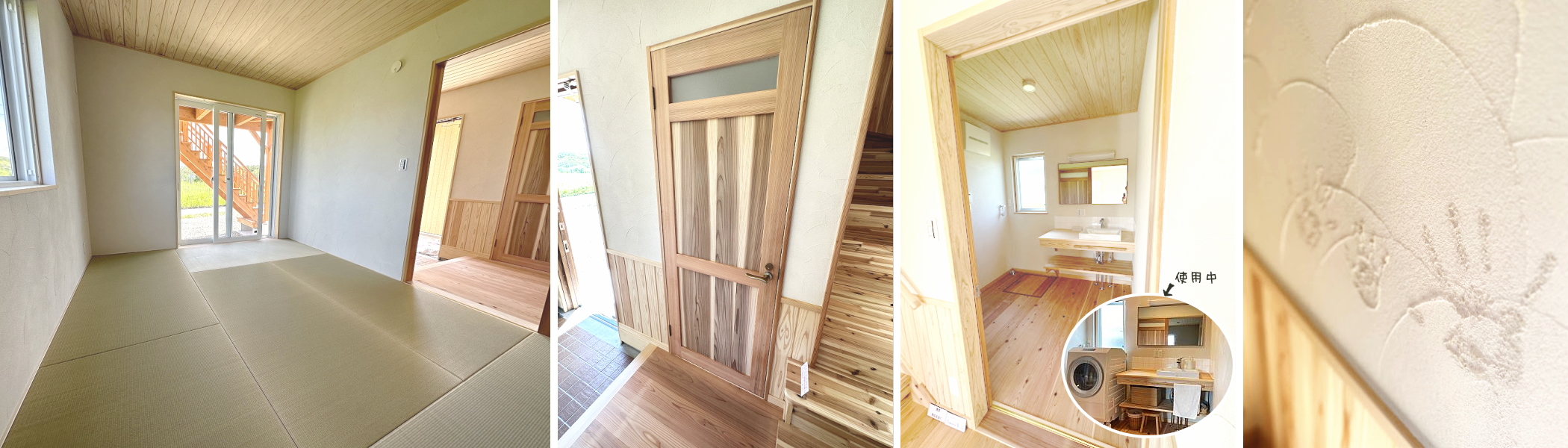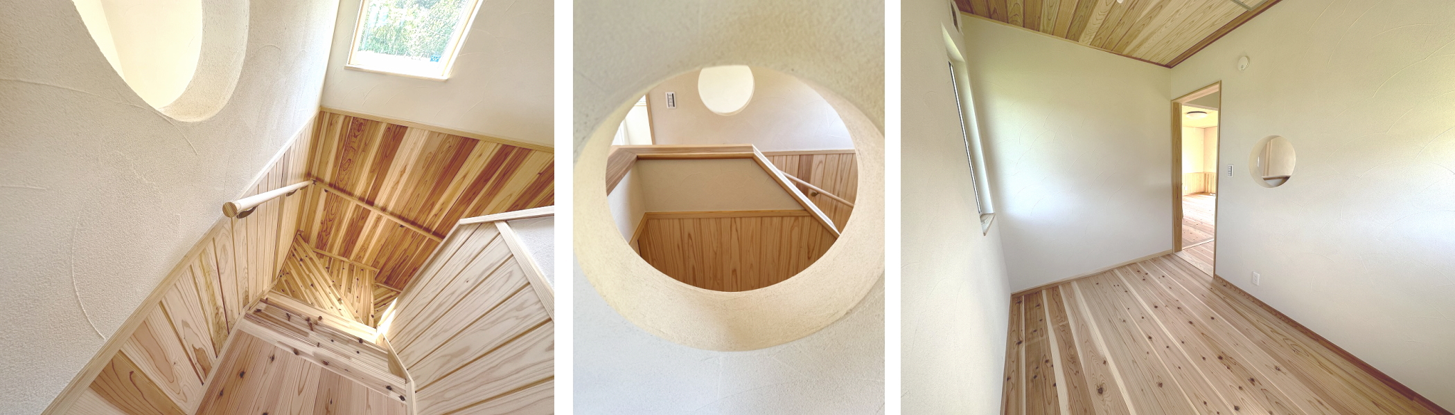 空間に優しさが溢れています、珪藻土と杉の羽目板が魅力的に組み合わさって、室内には可愛らしいRのくりぬきのぞき窓が配され、柔らかな雰囲気を演出しています。珪藻土と杉の羽目板が調和することで、空間全体がふんわりと包まれ、心地よい温もりが感じられます。特に、Rのくりぬきのぞき窓は、空間に遊び心を添え、かわいらしさを引き立てています。