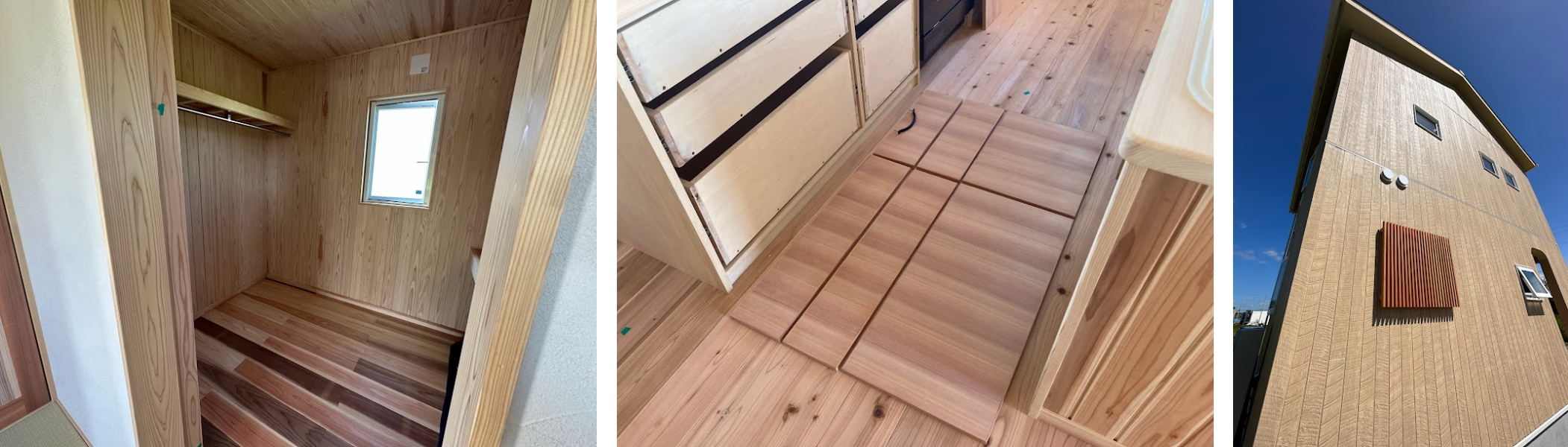 ウォークインクローゼットの床には、大工さんの遊び心が光ります。歩くたびに心地よい感触が広がります。ちょっとした贅沢を毎日の生活にプラスできるお家。外観の格子戸は木製に仕上げられ、優しい仕上がりに。